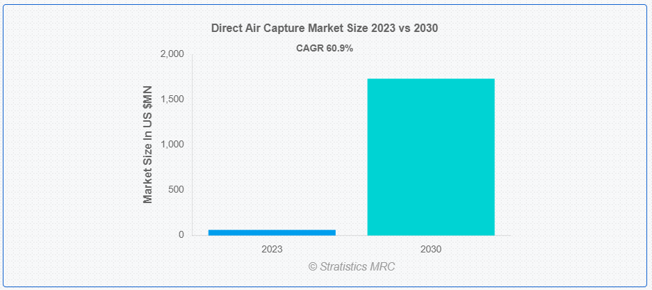 스트래티스틱스 MRC에 따르면 글로벌 직접 공기 포집 시장은 2023년 6,200만 달러 규모이며, 예측 기간 동안 60.9%의 연평균 성장률로 2030년에는 1,730.9억 달러에 달할 것으로 전망됩니다. 직접 공기 포집(DAC)은 주변 공기에서 이산화탄소(CO2)를 직접 제거하도록 설계된 기술입니다. 일반적으로 화학적 공정과 기계 시스템의 조합을 통해 대기에서 CO2 분자를 물리적으로 포집하여 기후 변화를 완화하는 방법입니다. 이러한 시스템은 공기를 흡입하여 CO2 분자를 선택적으로 포집하는 흡착제 또는 화학 용액을 통과시키는 방식으로 작동합니다.