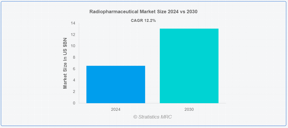 스트라티스틱스 MRC에 따르면 글로벌 방사성의약품 시장은 2024년 65억 5,000만 달러 규모이며 예측 기간 동안 12.2%의 연평균 성장률로 2030년에는 130억 6,000만 달러에 달할 것으로 예상됩니다. 방사성 의약품으로 알려진 특정 종류의 의약품은 방사성 동위원소로 구성되어 있습니다. 핵의학에서 이러한 물질의 대부분의 용도는 치료 및 진단입니다. 환자에게 진단 목적으로 방사성 의약품을 투여하면 방사성 의약품이 방출하는 방사선은 PET 및 SPECT와 같은 영상 기술로 기록되어 신체 내부 장기와 시스템의 세밀한 이미지를 생성합니다. 또한 치료 목적으로 사용되는 경우 방사성 성분이 방사선으로 암세포를 표적으로 삼아 파괴하는 암과 같은 질병을 치료하는 데 사용됩니다.